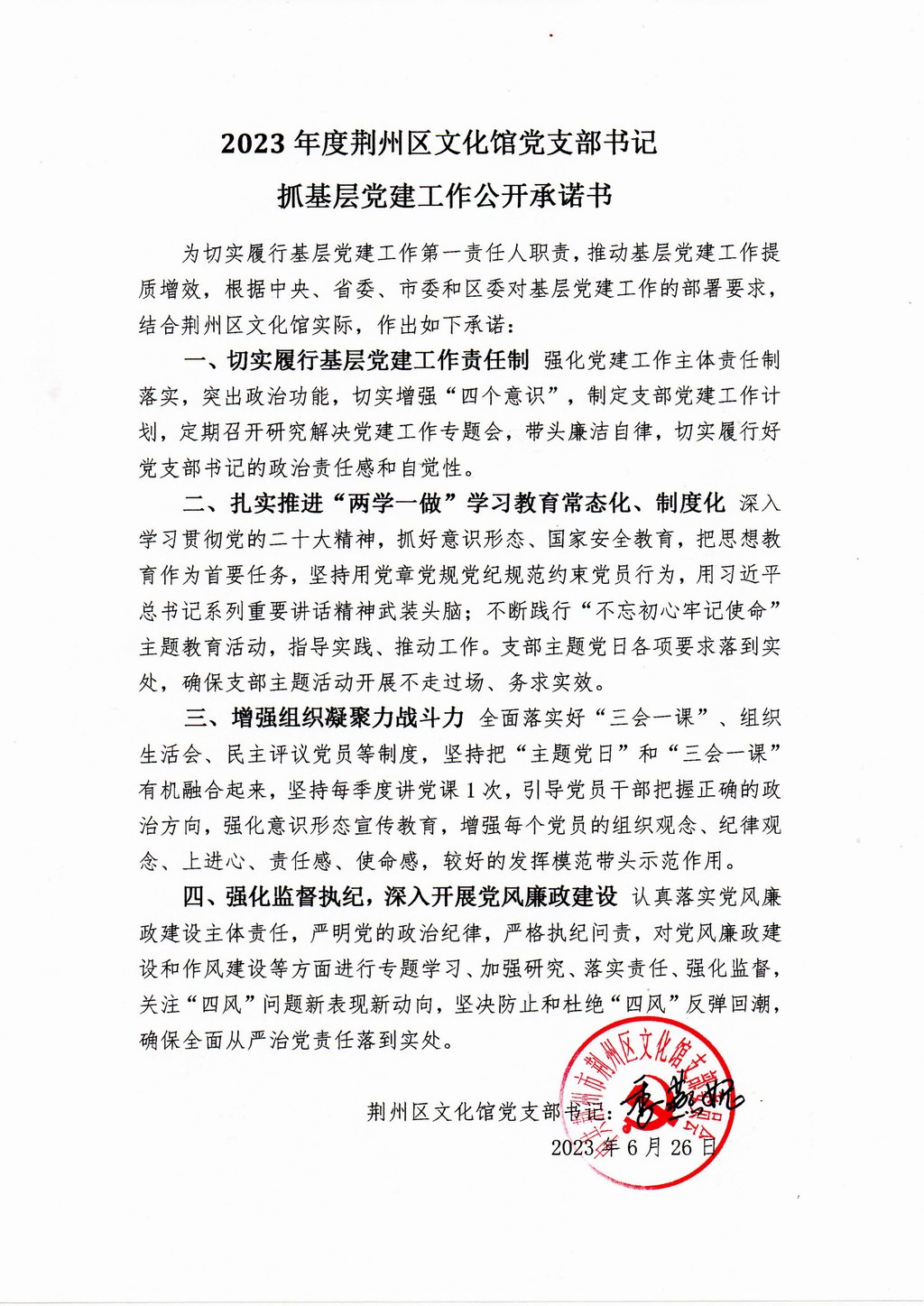 2023年度荆州区文化馆党支部书记抓基层党建工作公开承诺书